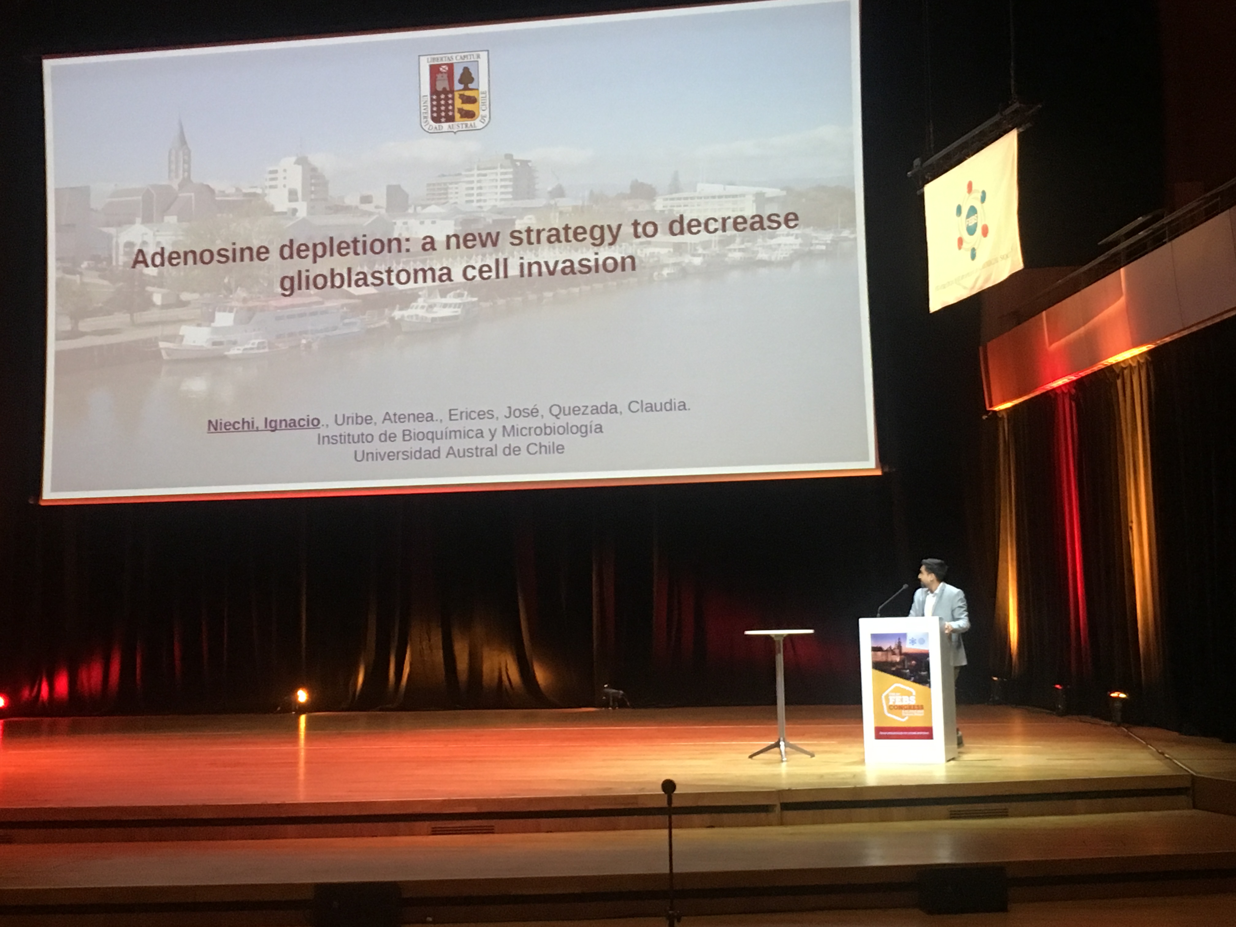 Durante los días que se llevó a cabo este importante encuentro científico, la delegación que representó a la Facultad de Ciencias de la UACh, estuvo compuesta por los estudiantes de postdoctorado: Dr. Ignacio Niechi; Dr. Sebastián Alarcón y el Dr. Ángelo Torres. A ellos tres se sumaron, Daniel Uribe y José Erices, estudiantes del Programa de Doctorado en Ciencias mención Biología Celular y Molecular. Este equipo de profesionales expuso dos investigaciones. La primera de ellas se titula Quimioresistencia en Glioblastoma y Alternativas Terapéuticas, y la segunda lleva por nombre Papel de Adenosina en Enfermedad Renal.