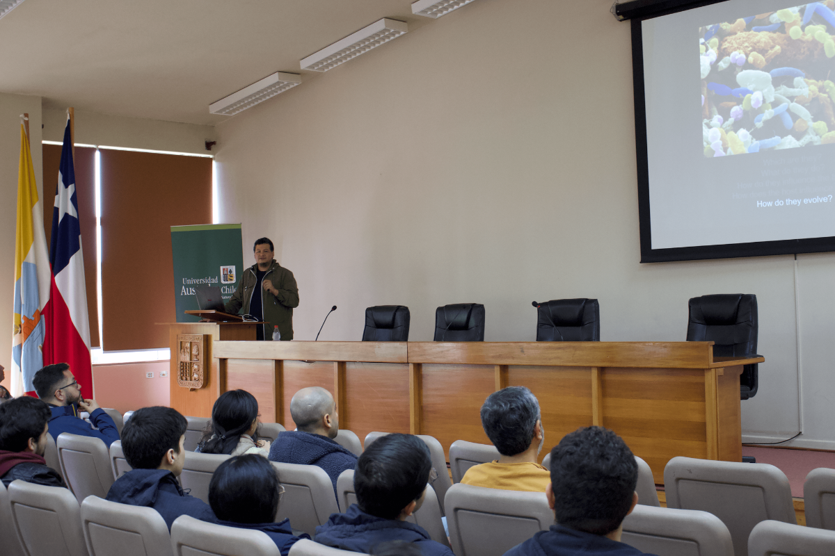 Durante su exposición, el Dr. Cárdenas dio a conocer el trabajo efectuado en su laboratorio, el cual está facalizado en el estudio de las propiedades de diferentes grupos de organismos asociados a seres humanos y cómo sus propiedades evolutivas han cambiado su interacción con sus hospederos, esto a través del uso de la bioinformática.