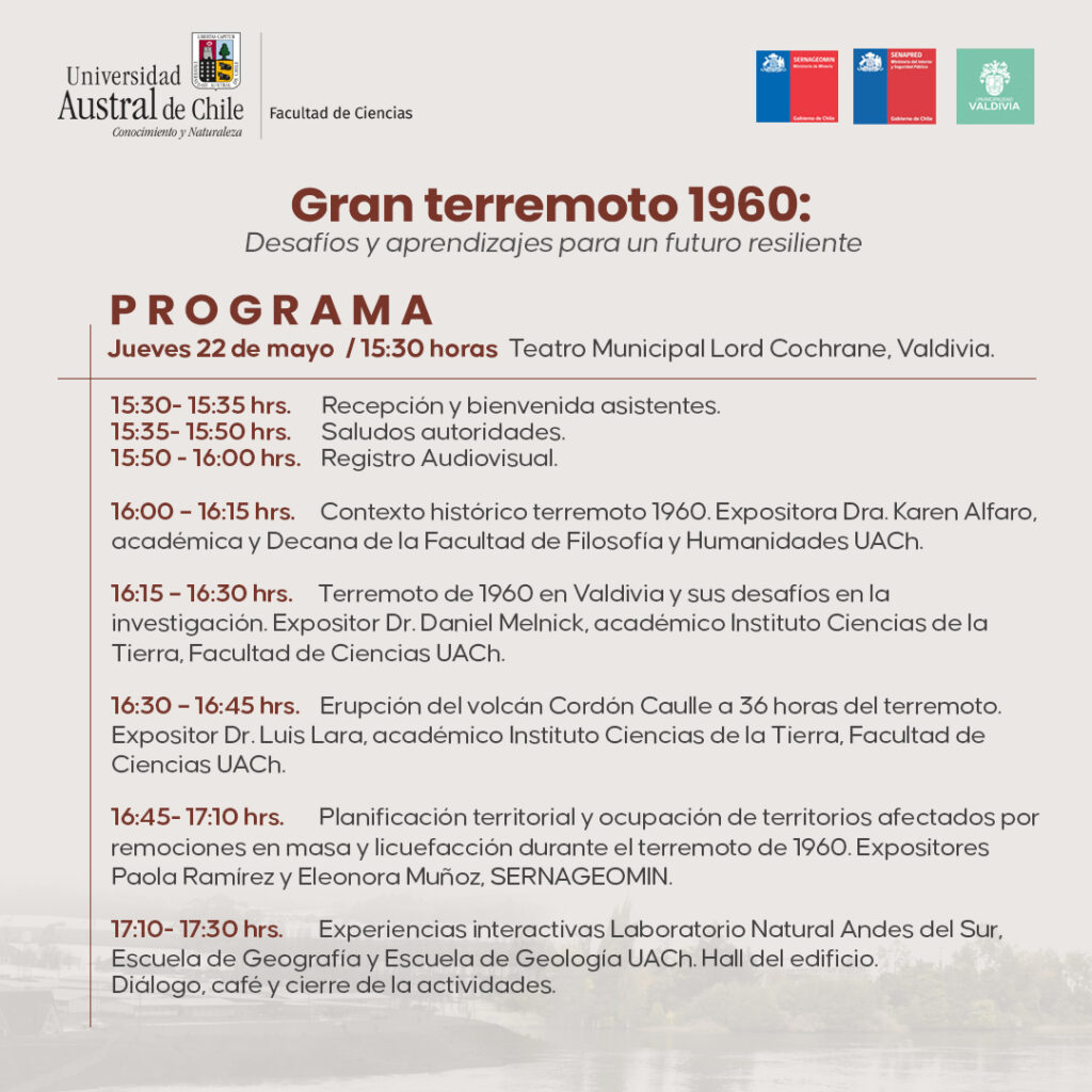 “Gran Terremoto 1960: Desafíos y aprendizajes para un futuro resiliente”, es el título de la actividad que conmemorará los 65 años del Terremoto de Valdivia de 1960, organizada por la Facultad de Ciencias, la Escuela de Geología y el Instituto de Ciencias de la Tierra de la Universidad Austral de Chile en conjunto con la Dirección Regional de SERNAGEOMIN Los Ríos.