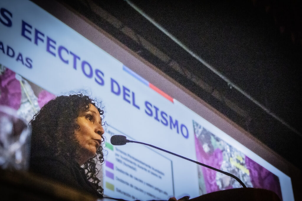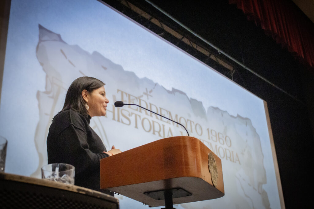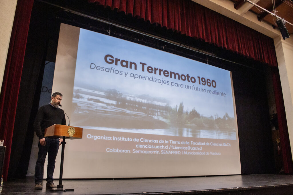 El Dr. Pablo Sánchez, geólogo y Director de la Escuela de Geología UACh, moderó el espacio de presentaciones, las que comenzaron con la ponencia “Terremoto de 1960, Historia y Memoria”, presentada por la Decana de la Facultad de Filosofía y Humanidades de la UACh, Dra. Karen Alfaro, quien señaló que para el terremoto un total de 11.800 viviendas fueron destruidas o inhabilitadas en la ciudad (40% del total) y en los sectores rurales cerca de 12.300 viviendas. Se evacuaron 20.178 personas en la Valdivia, cerca de 5.000 personas en Los Lagos, 920 personas en Antilhue, 600 en Pishuinco y 2.000 en Huellelhue.